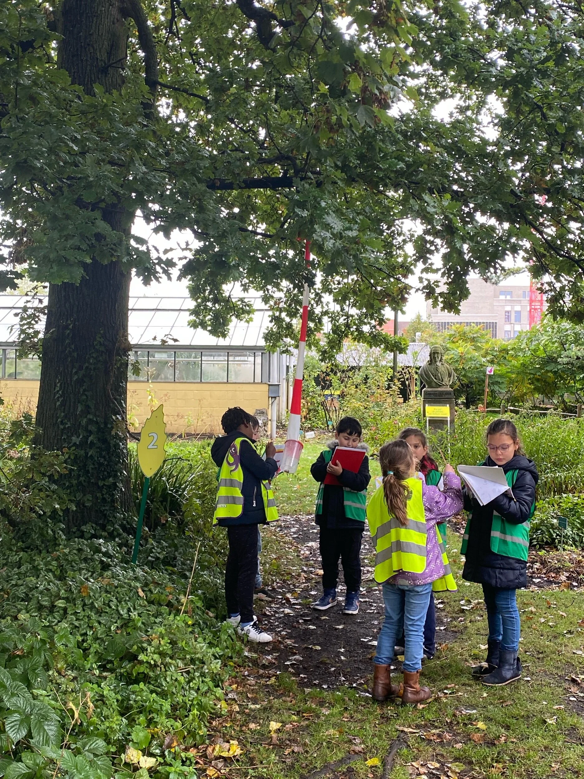 Ondanks het slechte weer gingen we met veel enthousiasme naar de Tuin van Kina. Daar werkten we in kleine groepjes om verschillende opdrachten op te lossen. We moesten onder andere zoeken naar bomen in de tuin en daarbij de passende vruchten en bladeren zoeken.