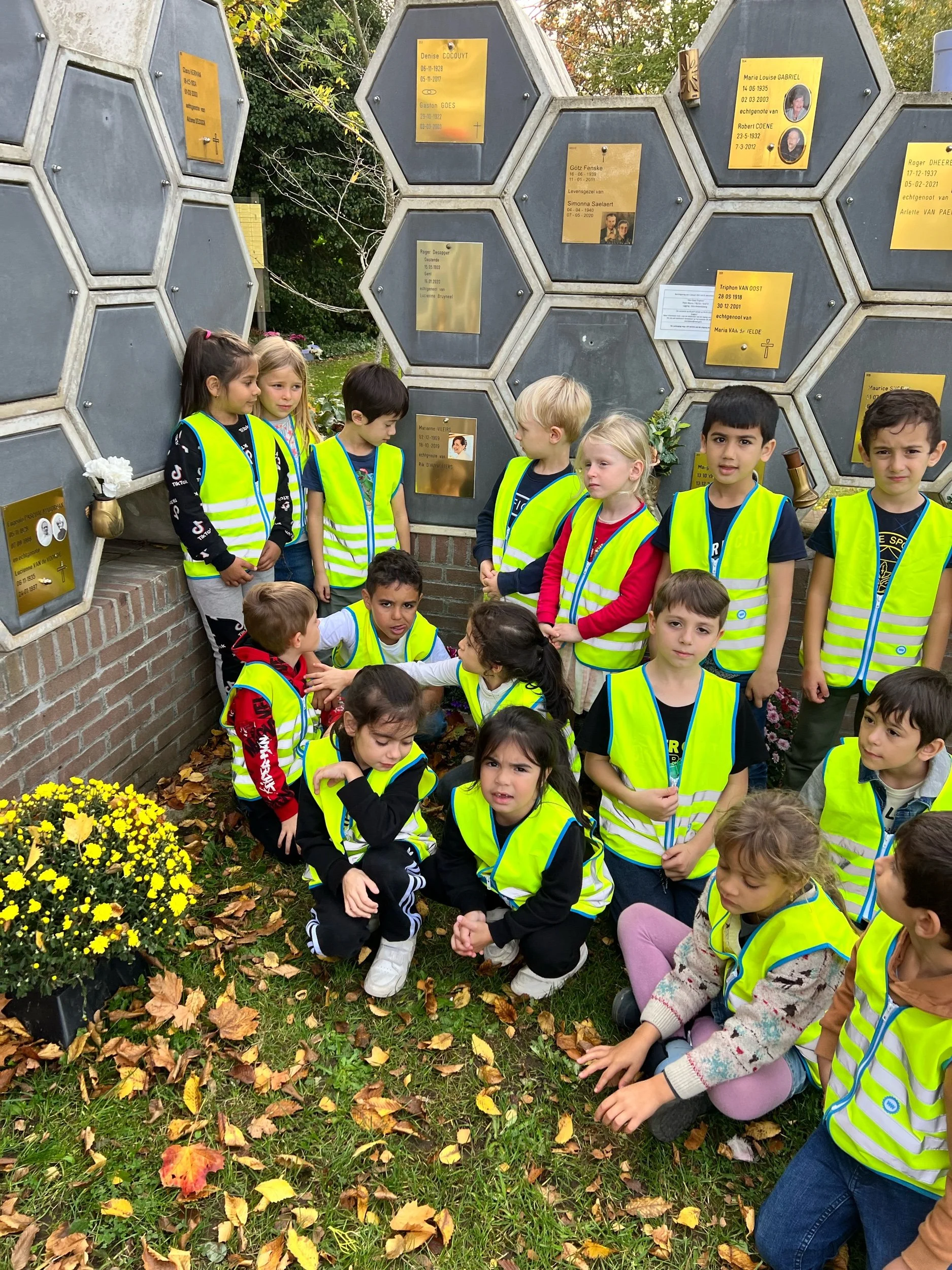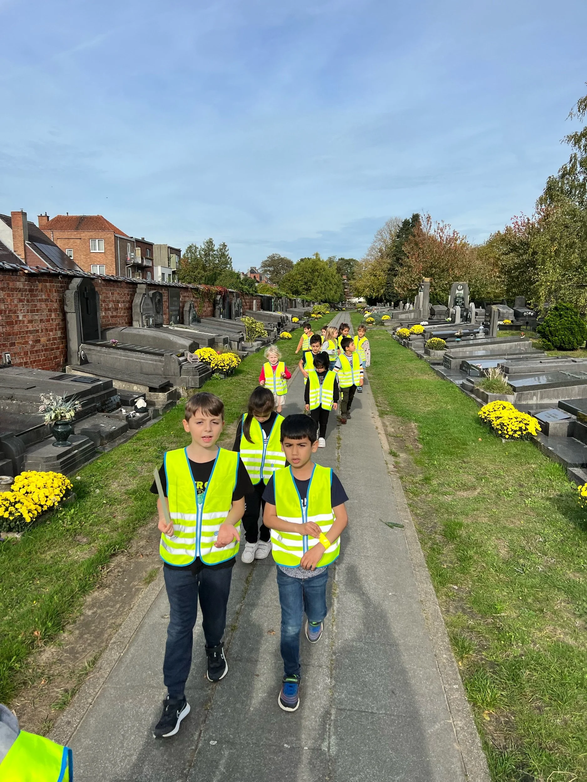 We brachten met de klas een bezoek aan het kerkhof. We zagen heel wat mooie bloemen want binnenkort is het Allerzielen.