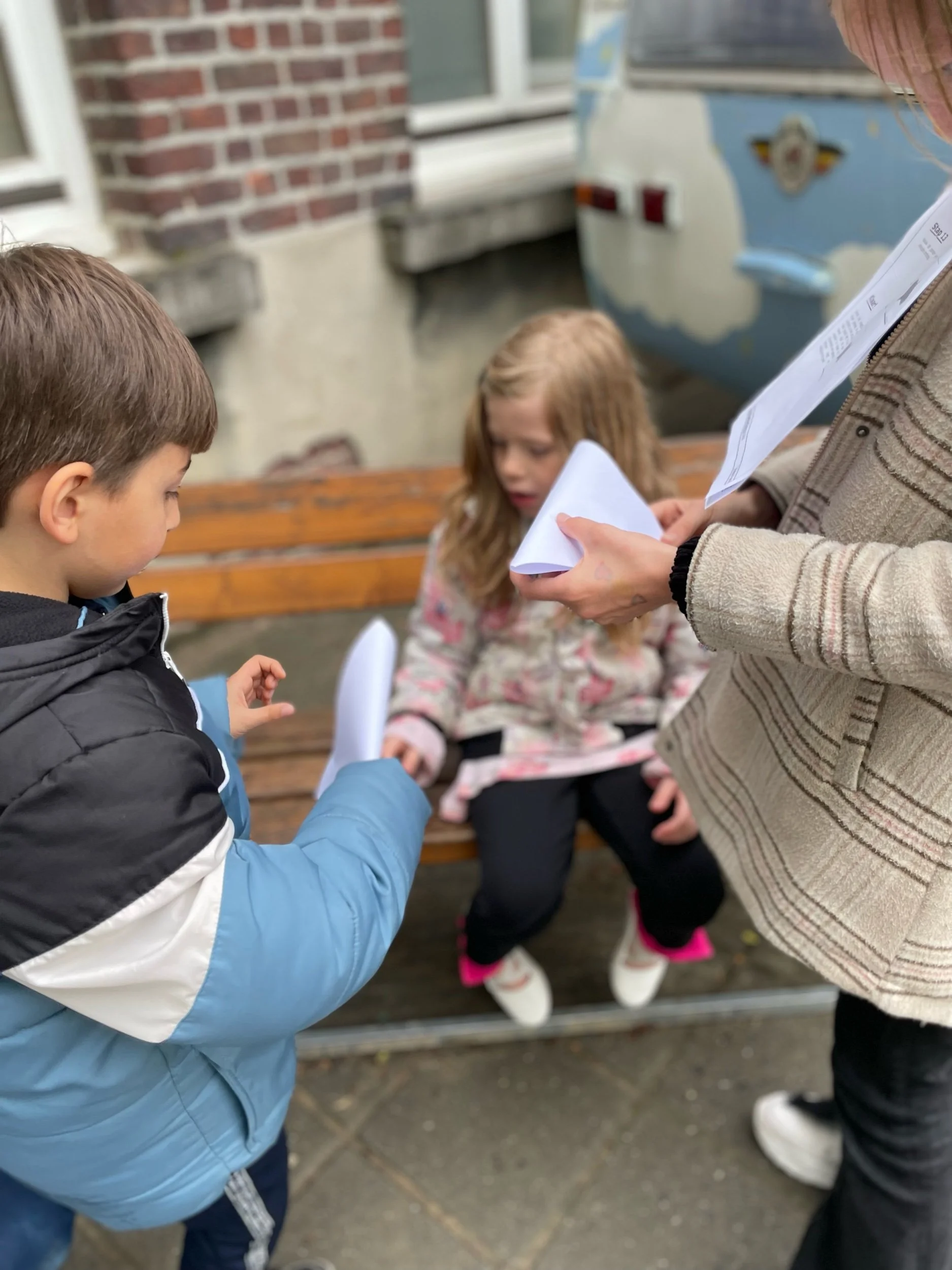Het eerste leerjaar is bezig met het thema techniek. We leren over soorten materialen en hoe spullen gemaakt worden. Daarom gingen we samen met onze meters en peters aan de slag en maakten we vliegtuigjes uit papier aan de hand van een stappenplan. We konden kiezen uit makkelijke en moeilijke vliegtuigjes. Wie gooit het verst?