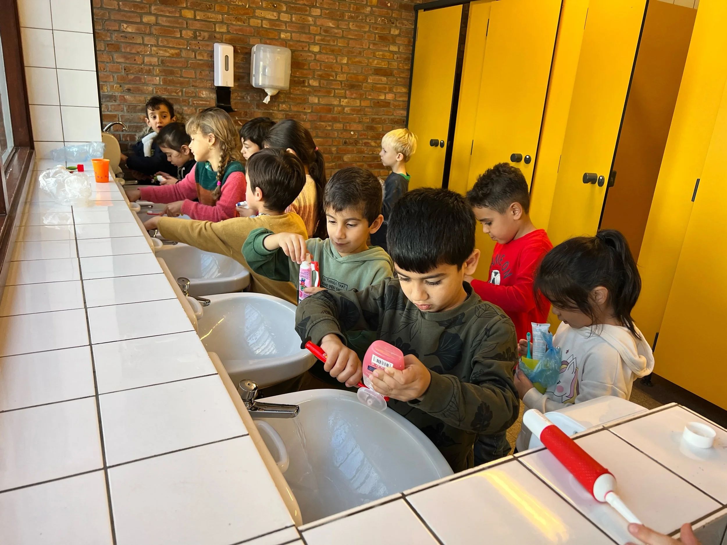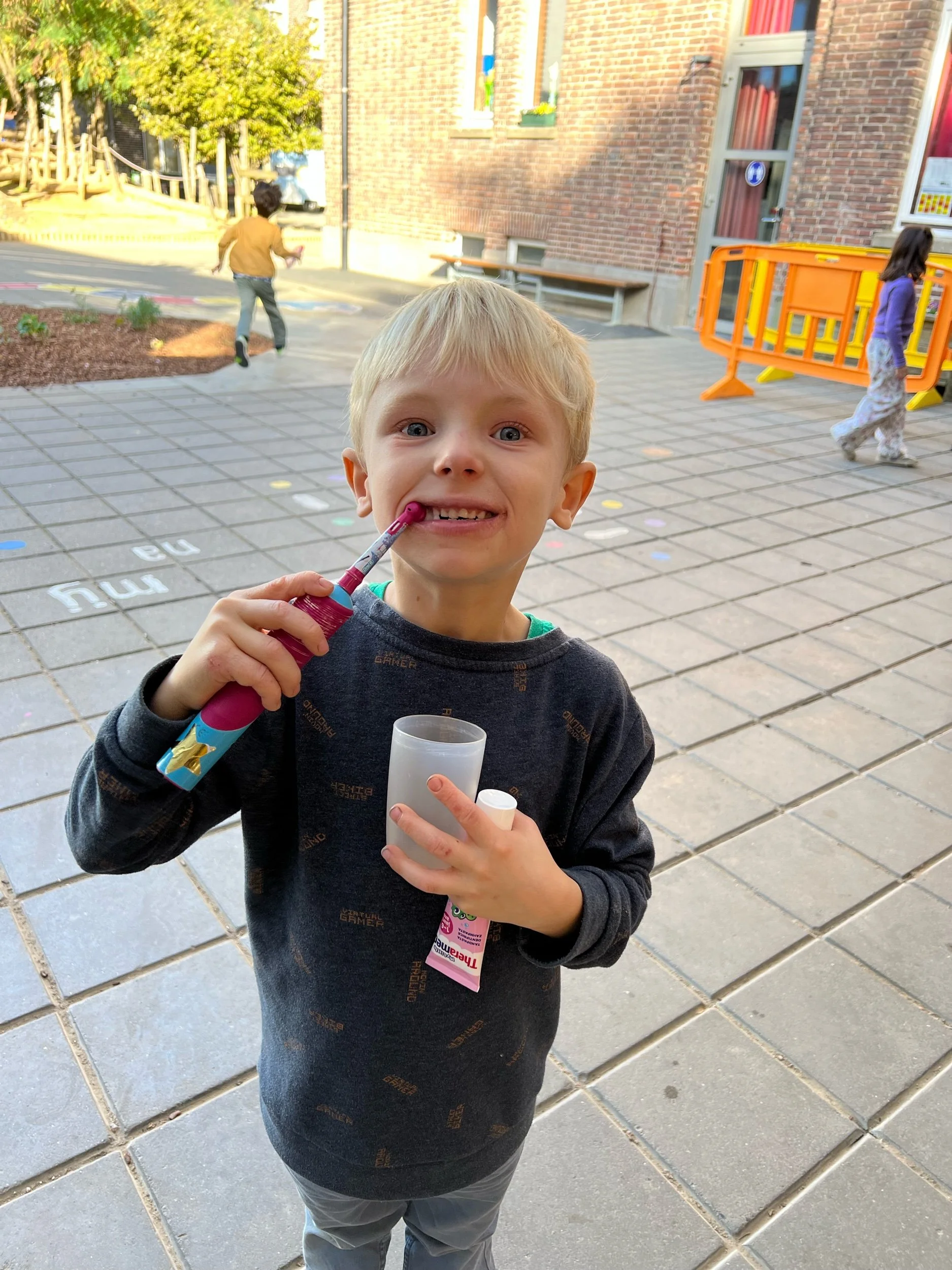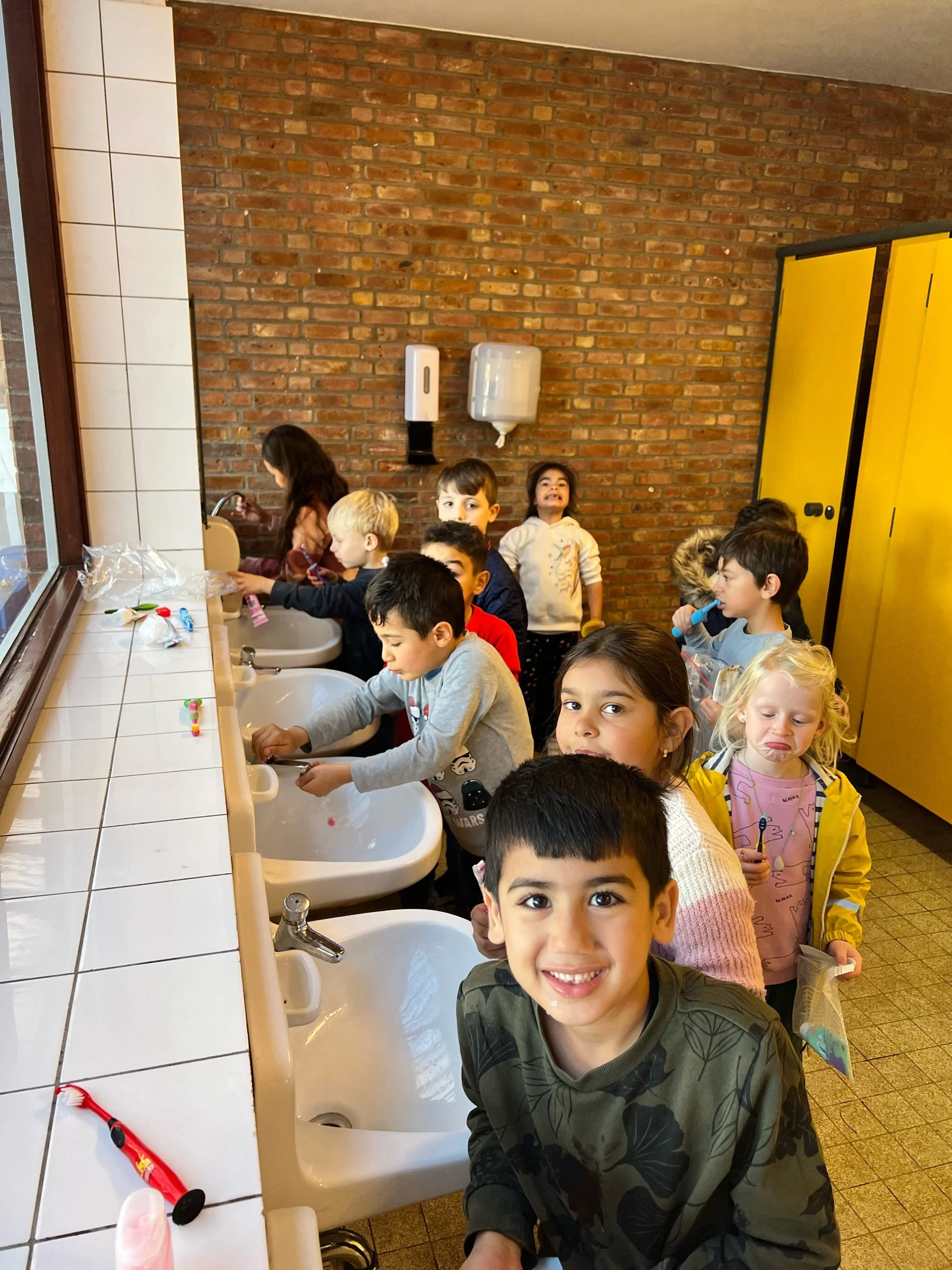 Voor één keer mochten de kinderen met een lege maag naar school komen om samen gezellig te ontbijten. We aten iets uit elke groep van de voedingsdriehoek en kregen op het einde ook een mooie brooddoos van de CM! Samen met juf Rein hebben we ook nog wat ochtendgymnastiek gedaan zodat we de dag fris konden beginnen. Daarna poetsten we ook allemaal samen onze tandjes. Wat een gezonde dag!