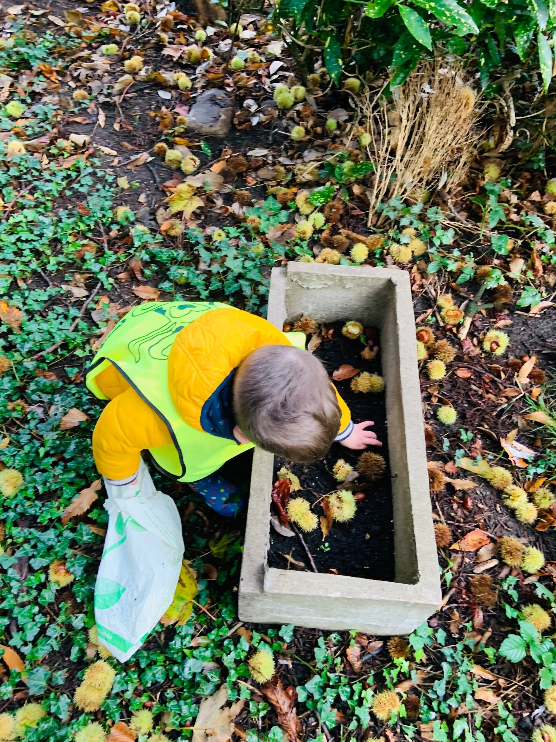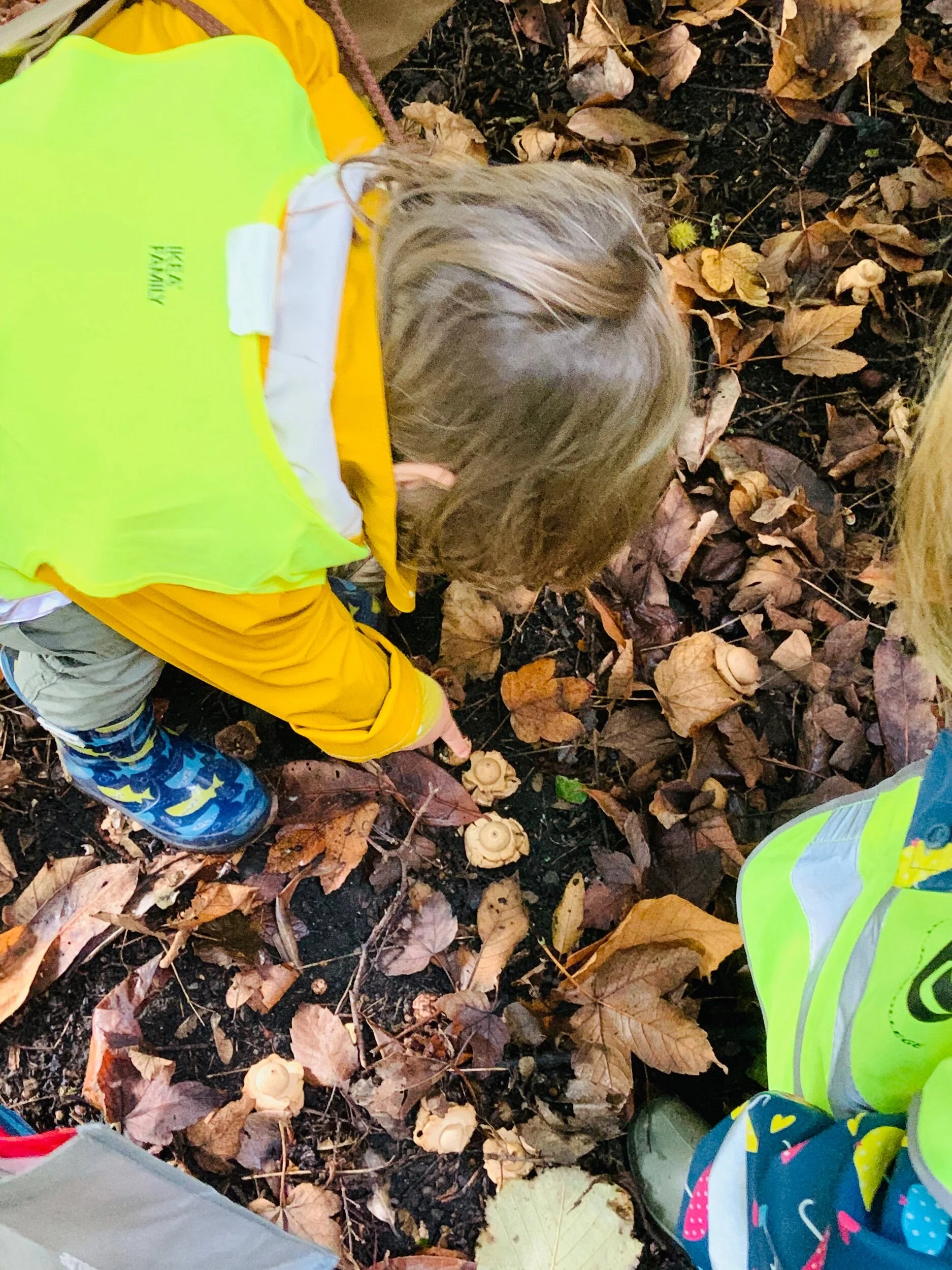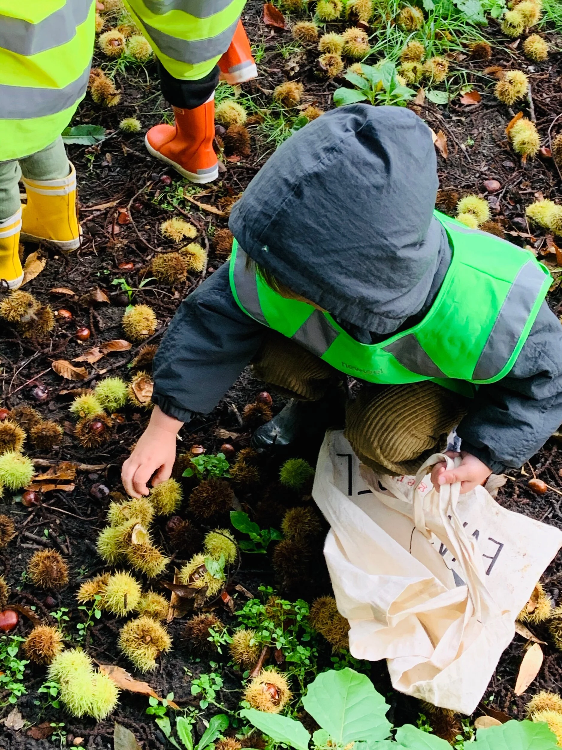Daar vonden we al meteen wilde en tamme kastanjes, bolsters, enkele beukennootjes, takken, blaadjes van de bomen,… We verzamelden de herfstvruchten in onze zakjes en namen ze mee naar de klas waar we onze schatten bekeken en een plekje gaven om volgende week mee te spelen, te knutselen,…