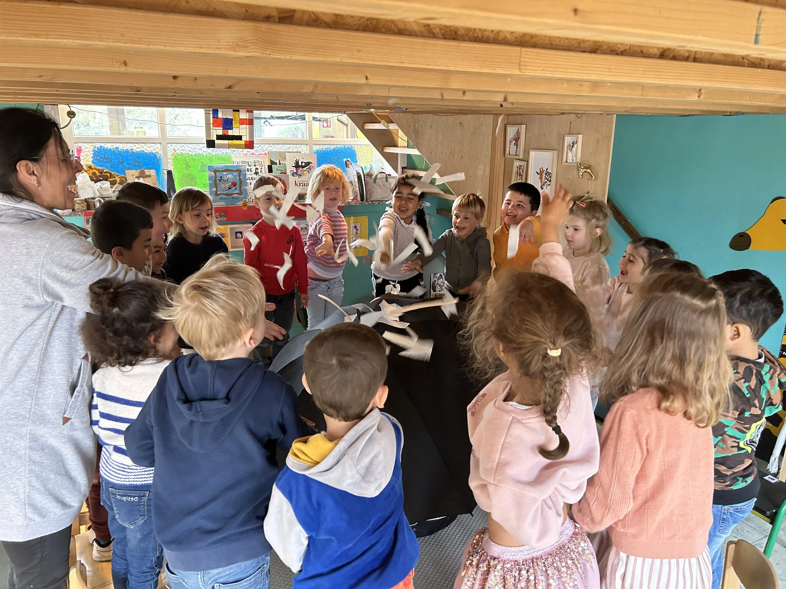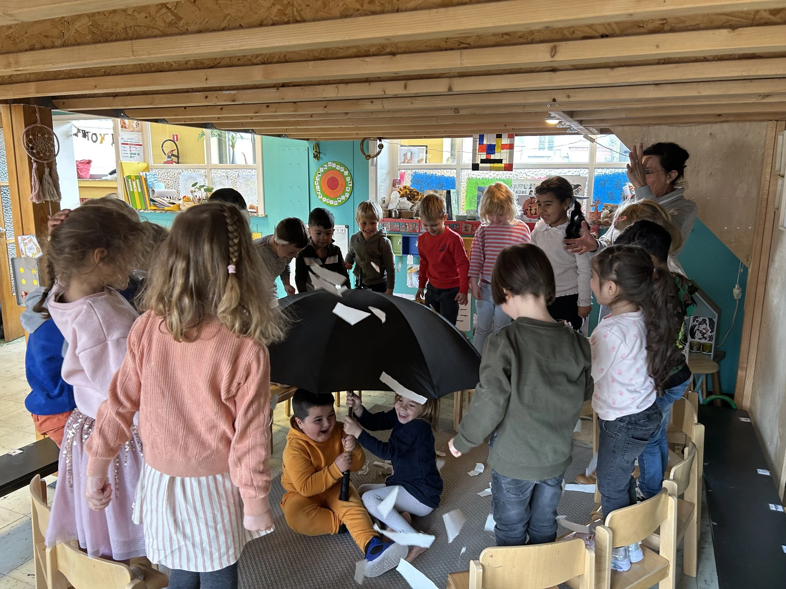 Om de beurt mochten we ons verstoppen onder haar grote paraplu. Op het ritme van de muziek gooiden we regendruppels in de lucht.