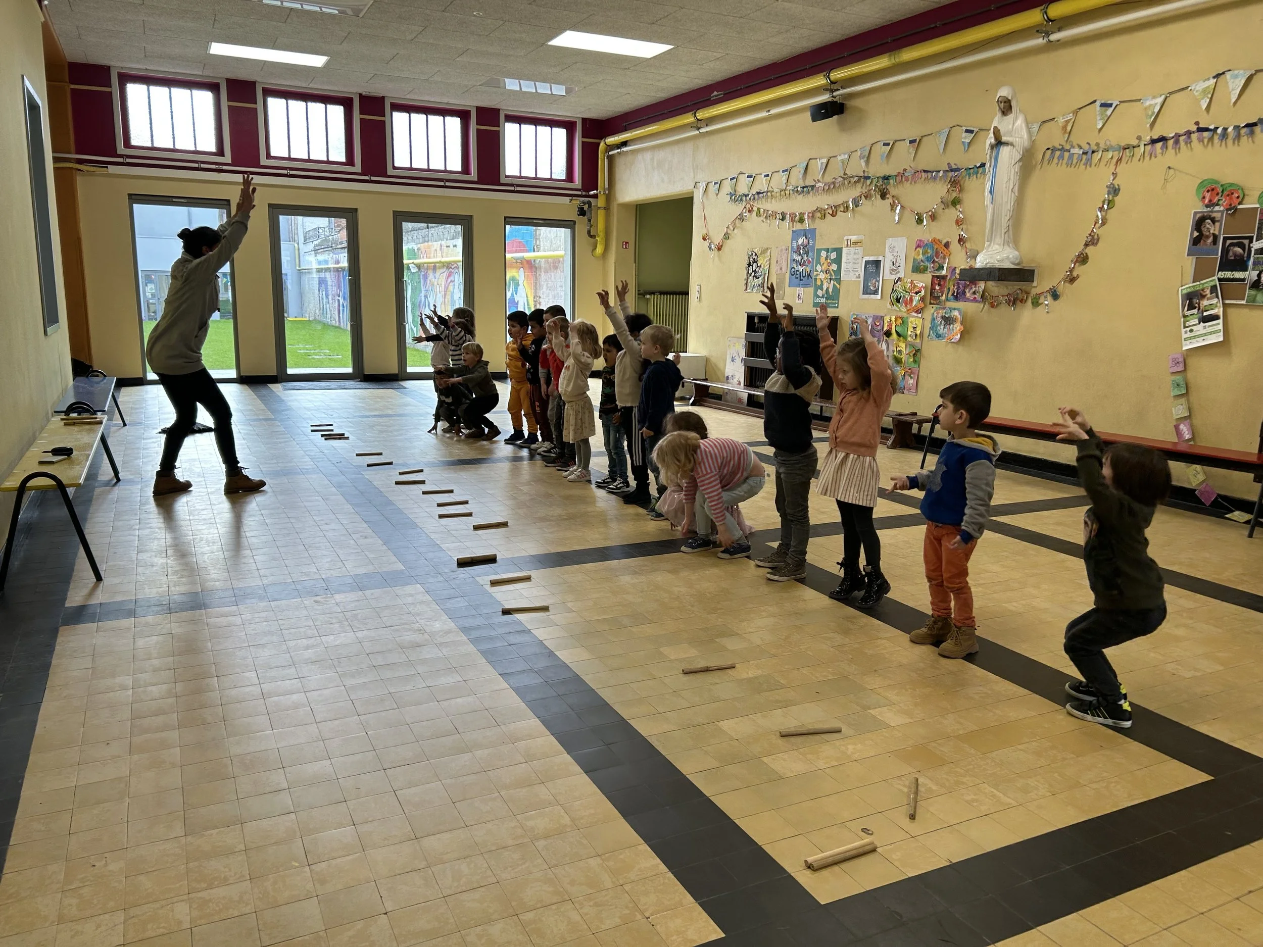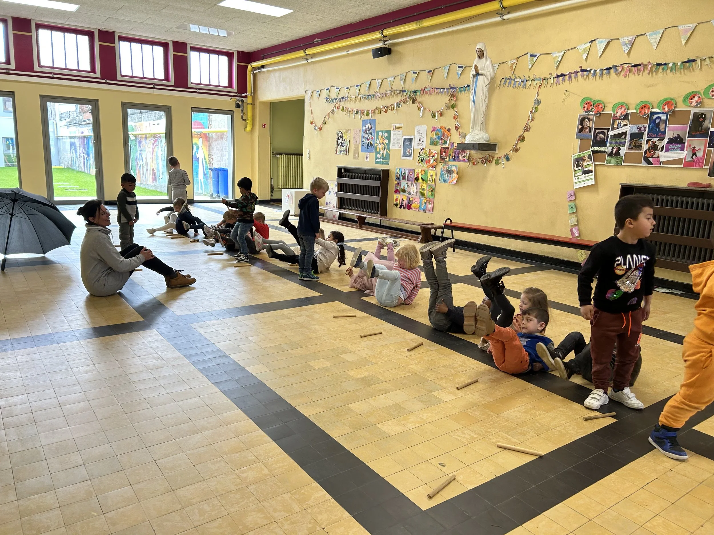 Nadien bootsten we ook het geluid na van regendruppels door te tikken met houten stokjes. We gingen nadien op stap en deden een echte regendans.
