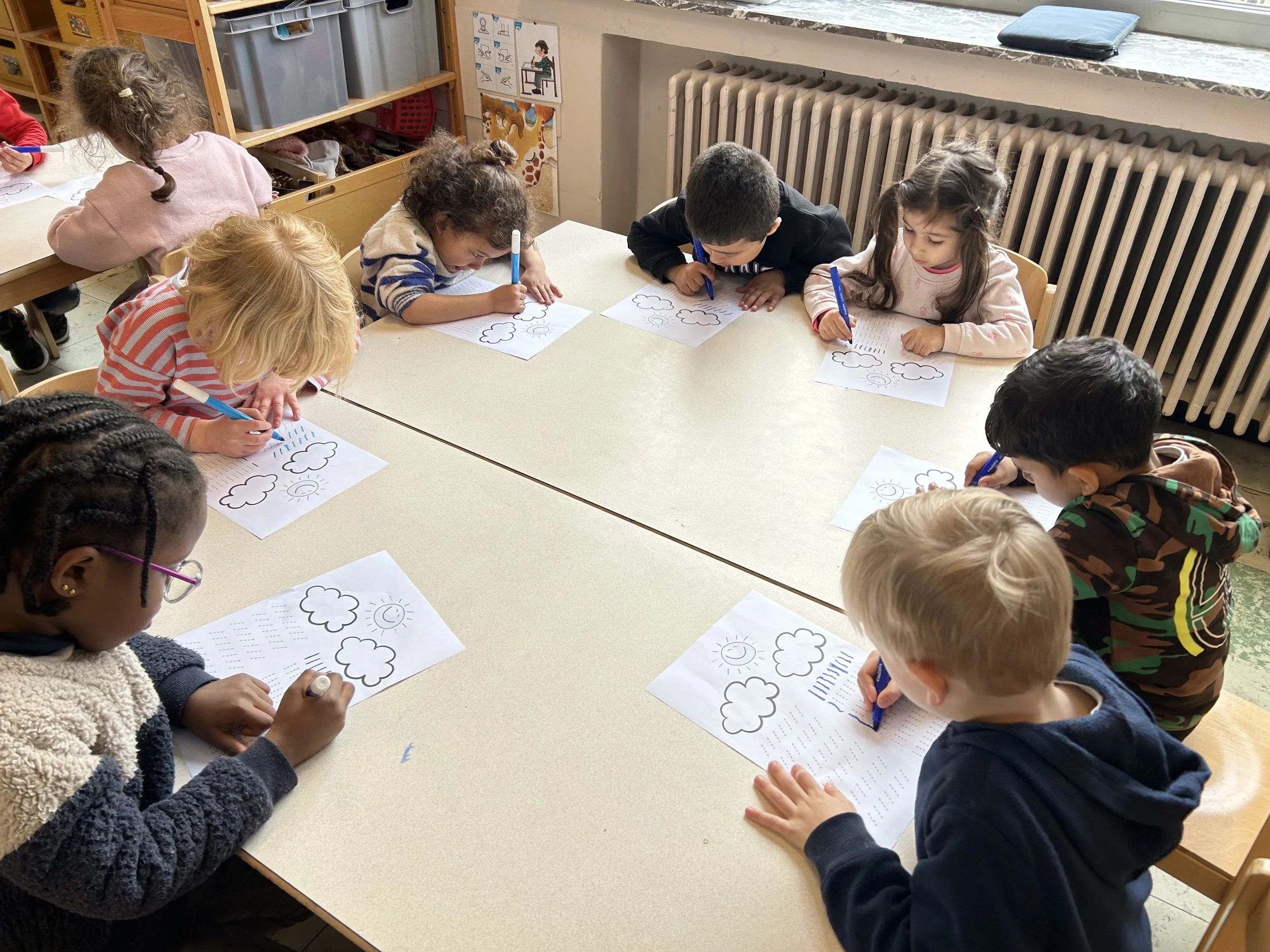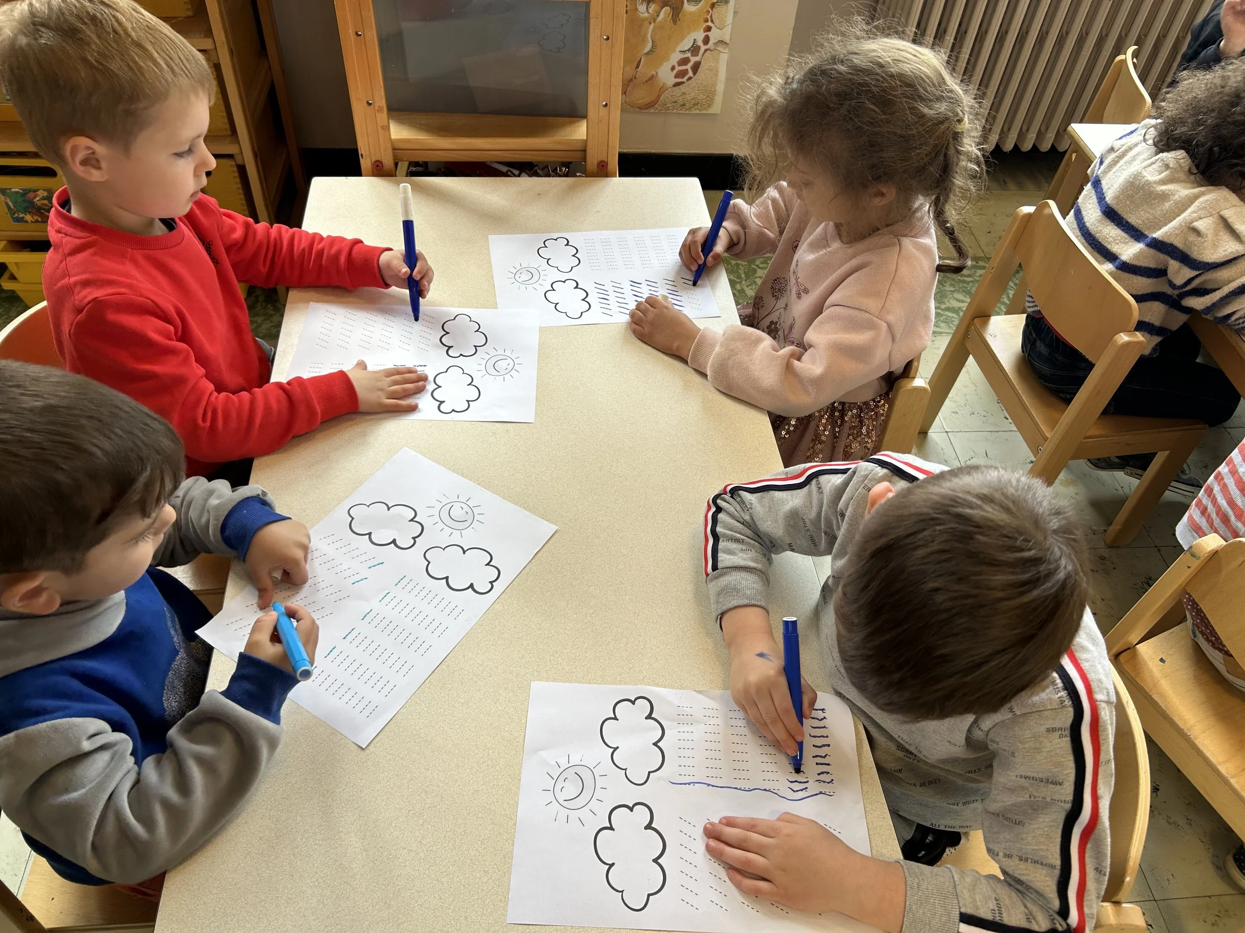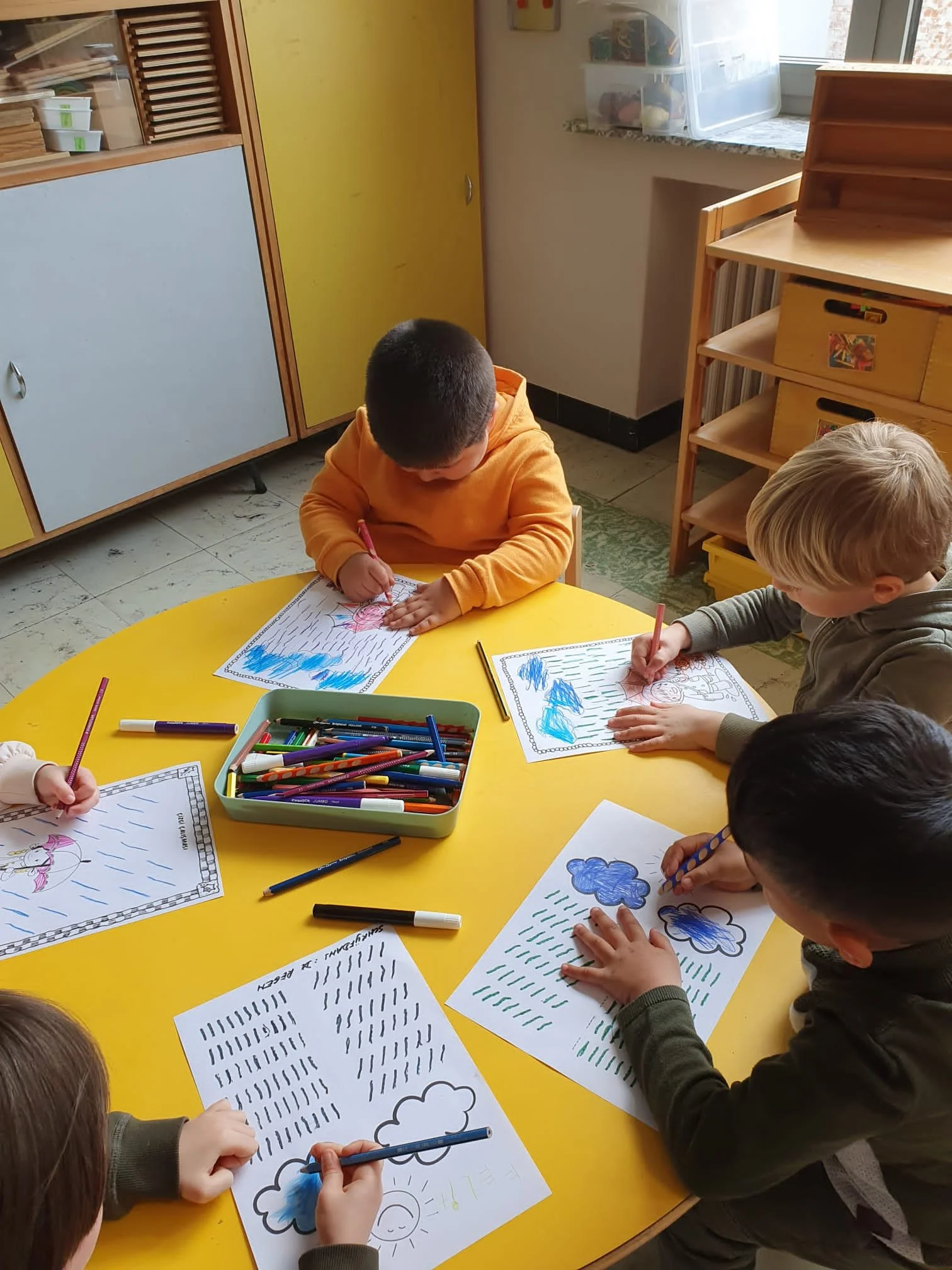 Samen met juf Ann genoten we opnieuw van een schrijfdans. Deze keer geen vormen of patronen, maar een echte regendans.