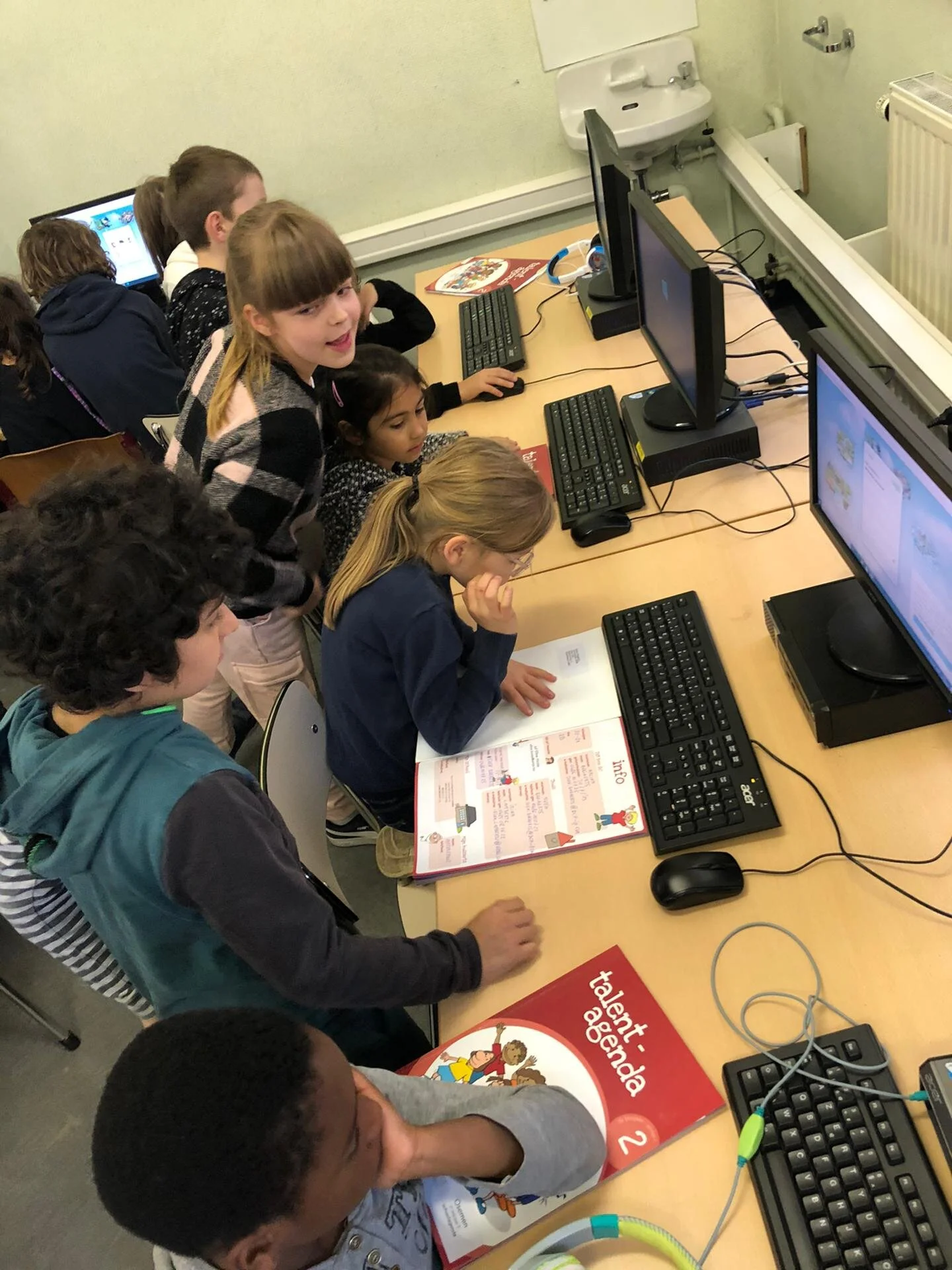 Vandaag gingen de kinderen van 2B voor het eerst dit schooljaar naar de computerklas. De kinderen van 4C waren hun buddy. Samen lukte het heel goed om de computer op te starten, wachtwoorden in te tikken en taken te maken op Bingel.