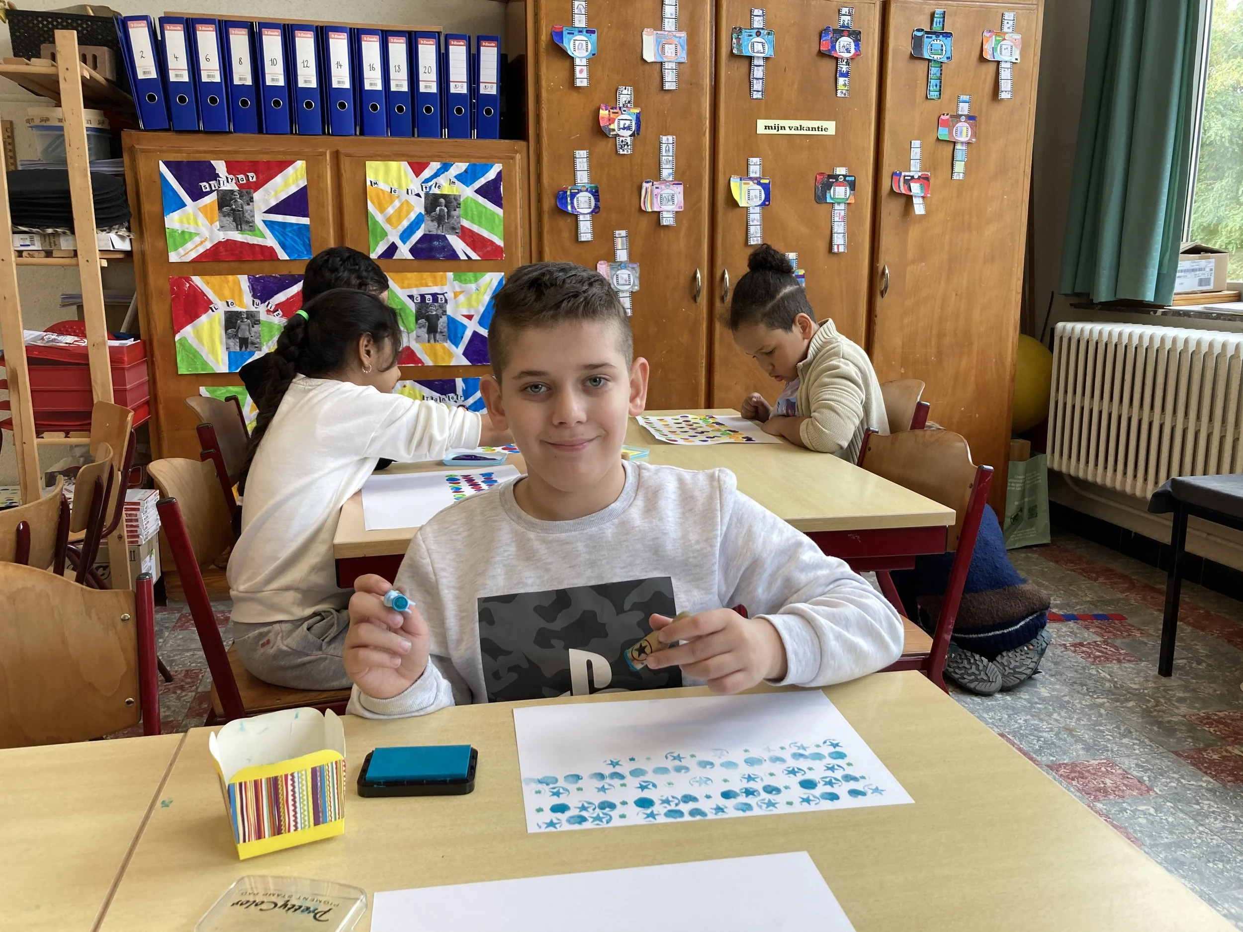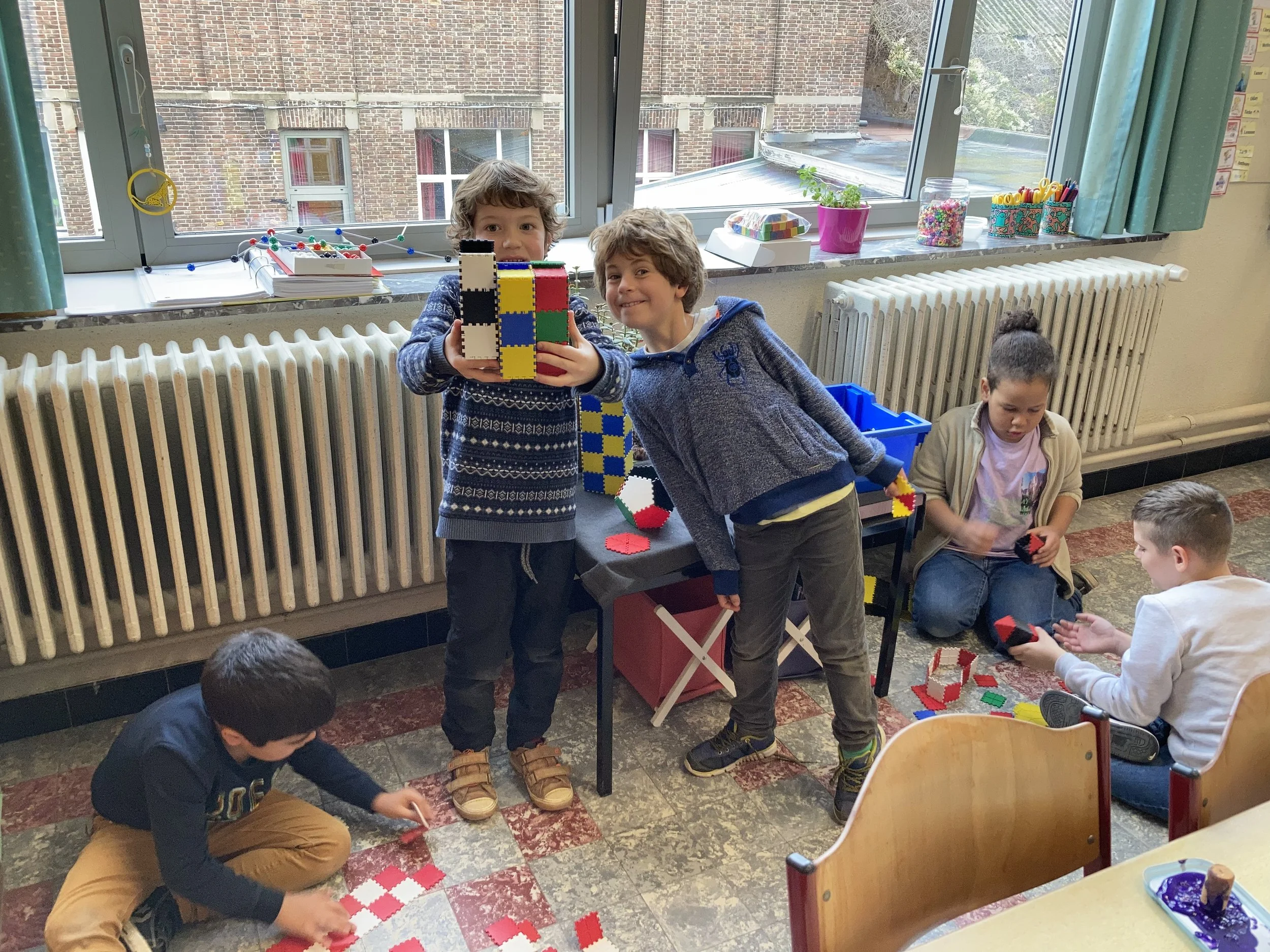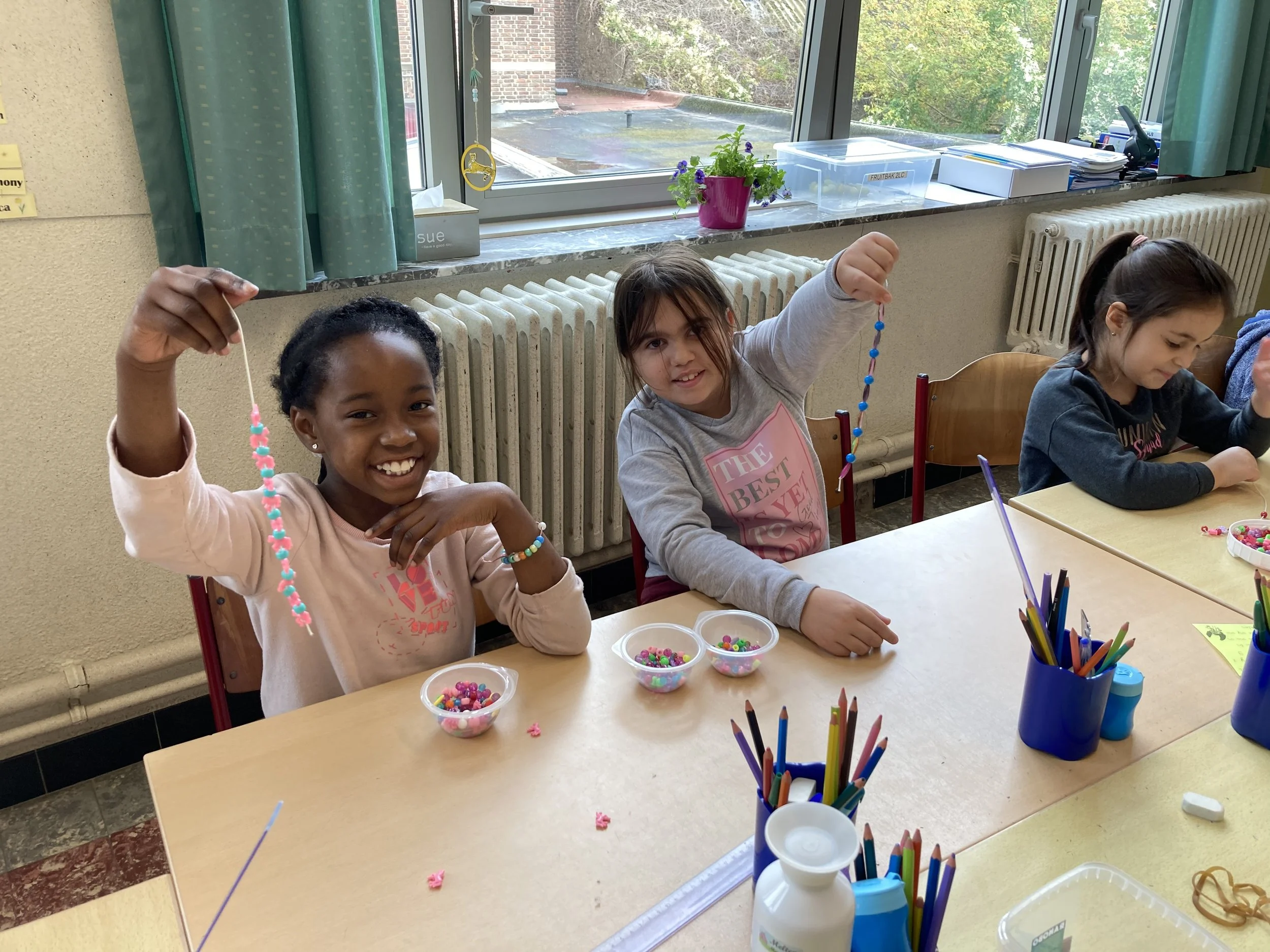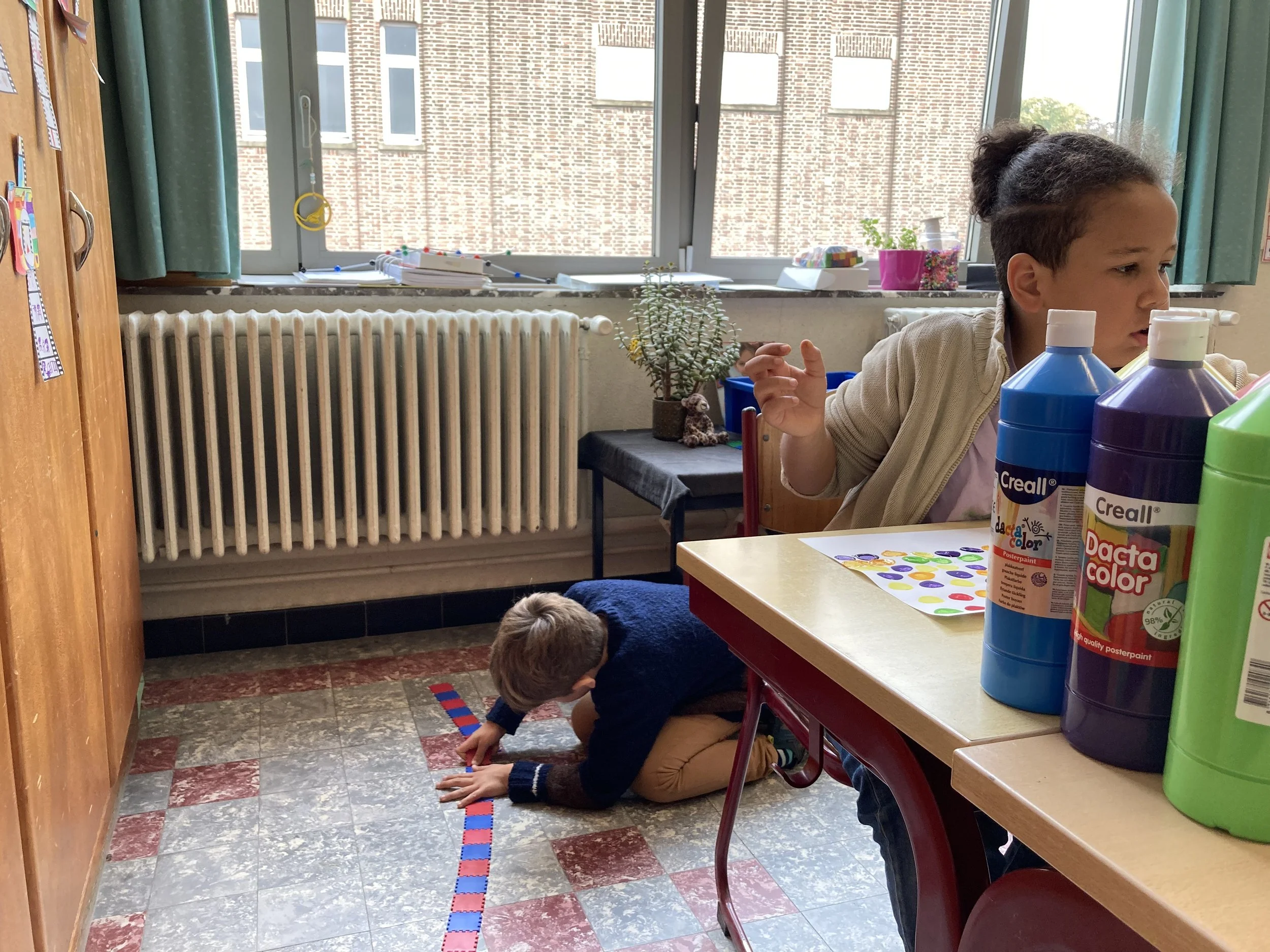 Na het serieuze werk, gingen we aan de slag met verf, stempels, kralen en speelgoed om verder ondergedompeld te worden in de wereld der patronen. Soms waren we verbaasd door de schoonheid ervan. Maar op andere momenten waren we blij met wat extra hulp van een klasgenootje.