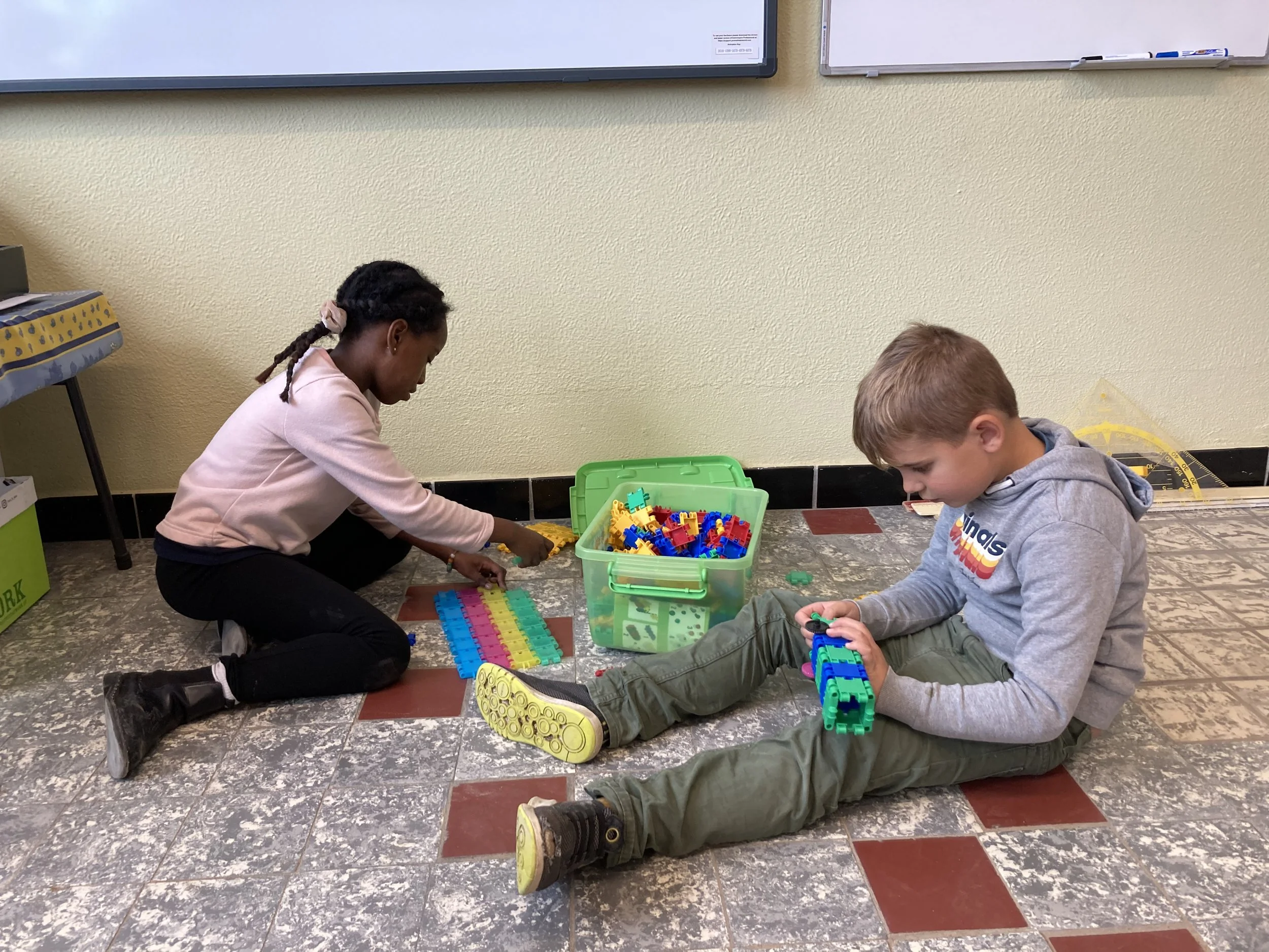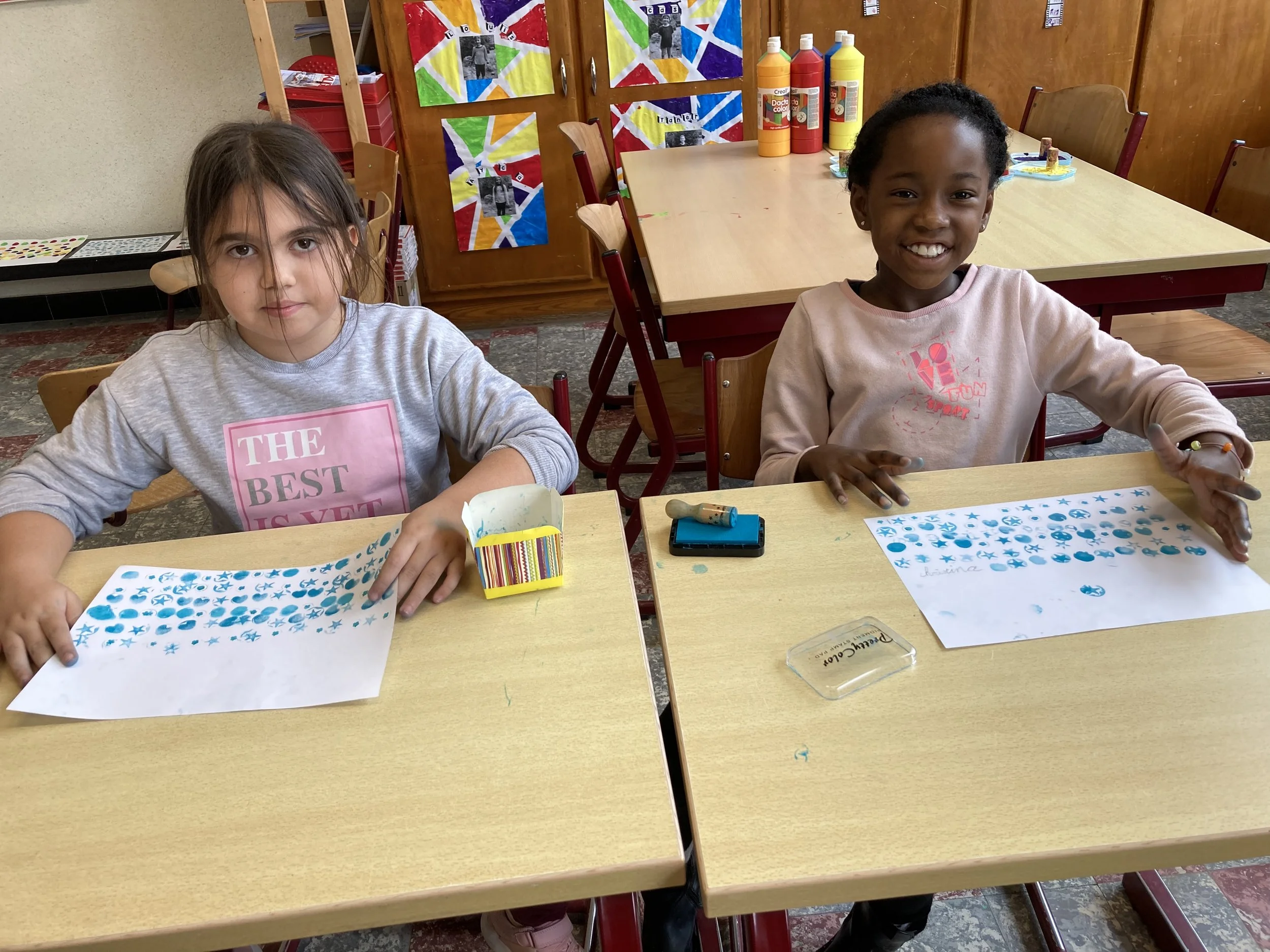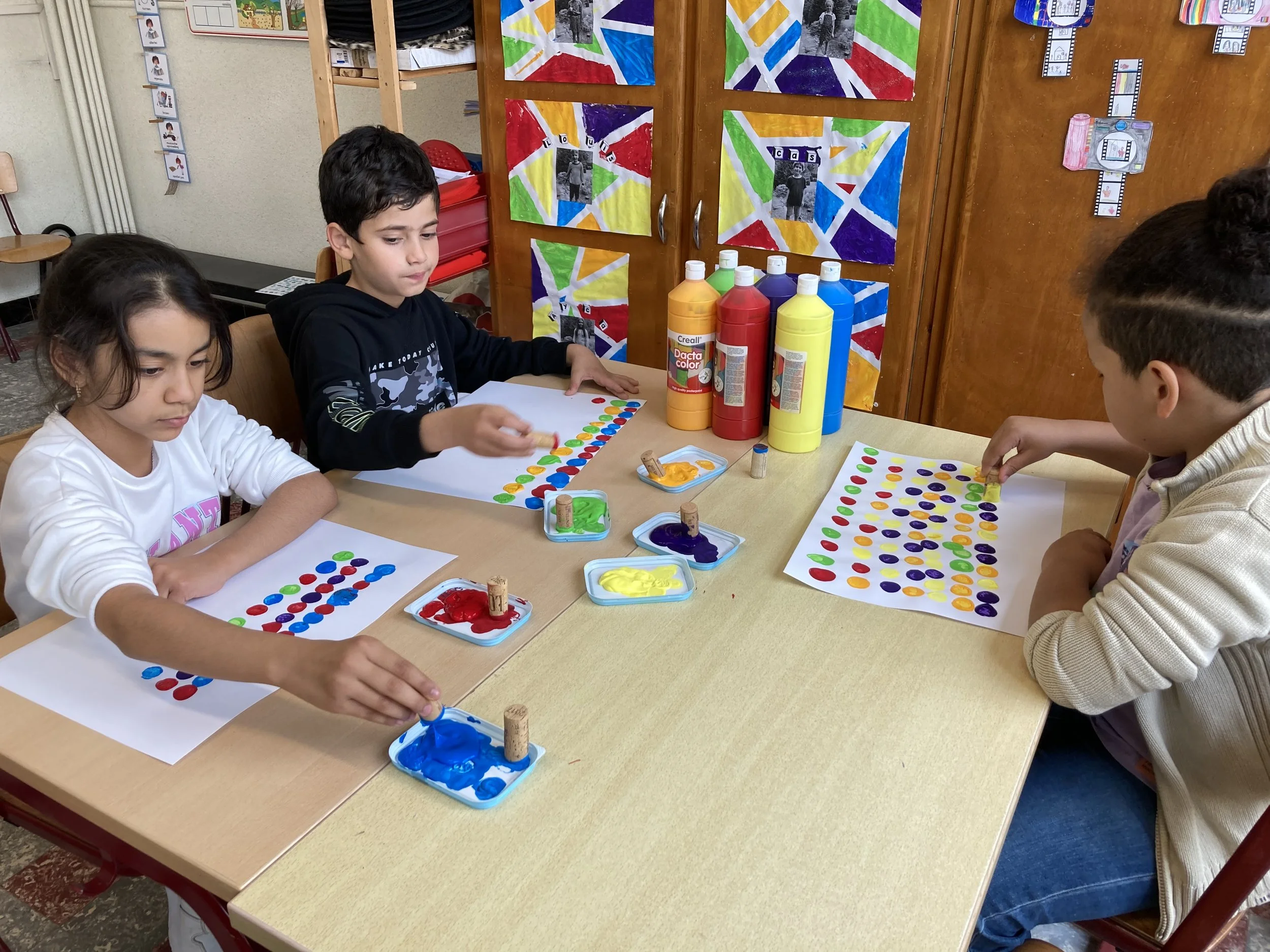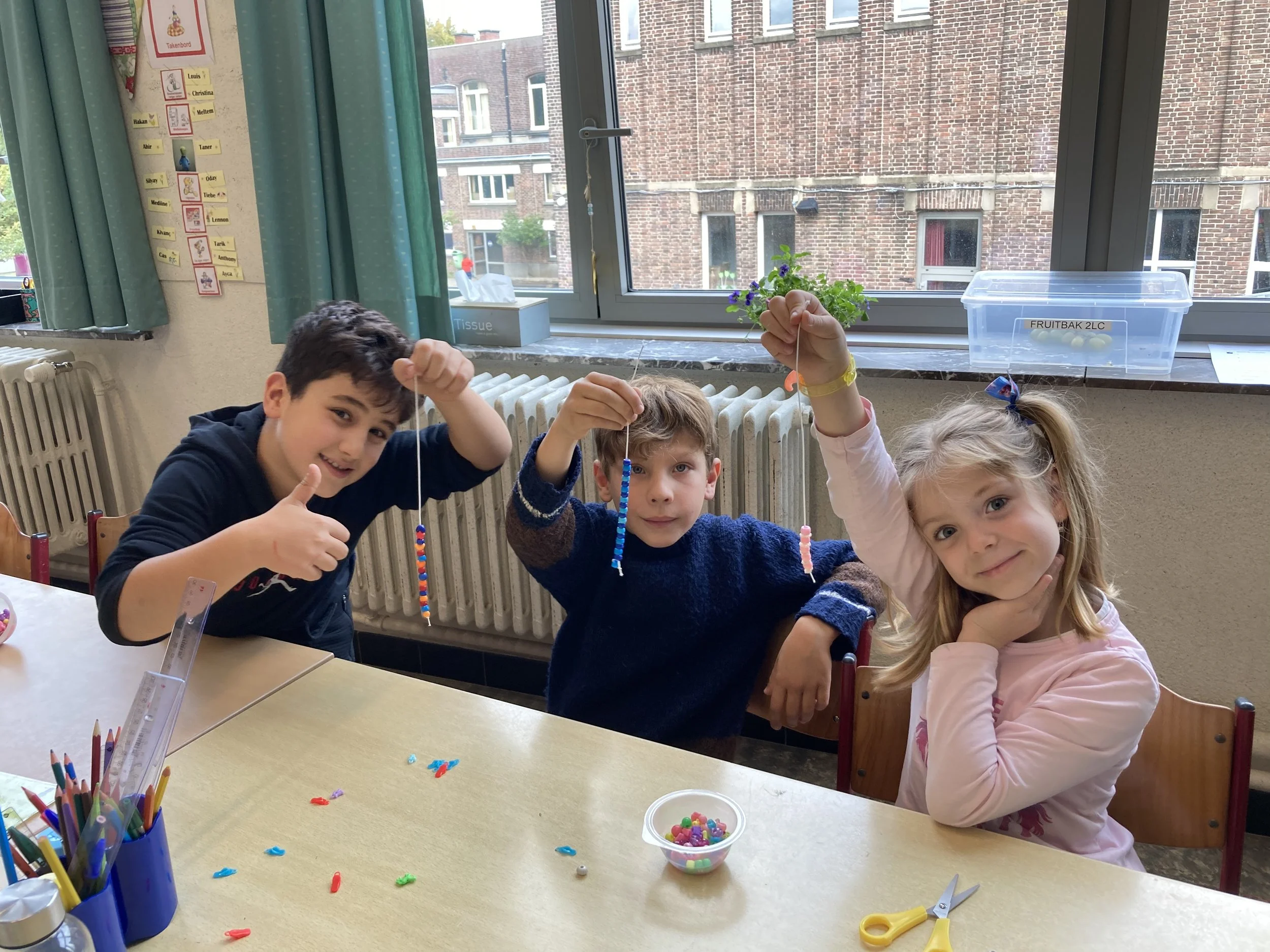 Na het serieuze werk, gingen we aan de slag met verf, stempels, kralen en speelgoed om verder ondergedompeld te worden in de wereld der patronen. Soms waren we verbaasd door de schoonheid ervan. Maar op andere momenten waren we blij met wat extra hulp van een klasgenootje.